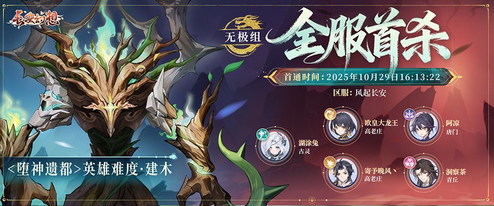 星火锋芒贯苍穹!恭喜来自<风起长安>的御灵师【@湖涂兔、@欧皇大龙王、@寄予晚风丶、@阿凉、@洞察茶】斩获<英雄·建木>无极组全服首杀,此役荣光昭告四海,其名自此响彻长安,无极之境冠绝寰宇!
