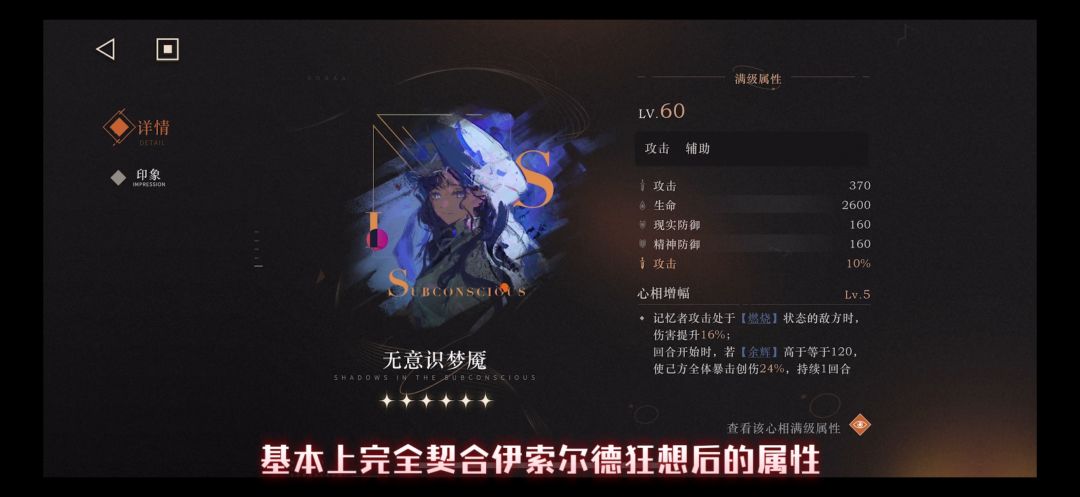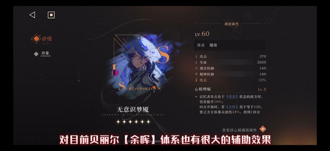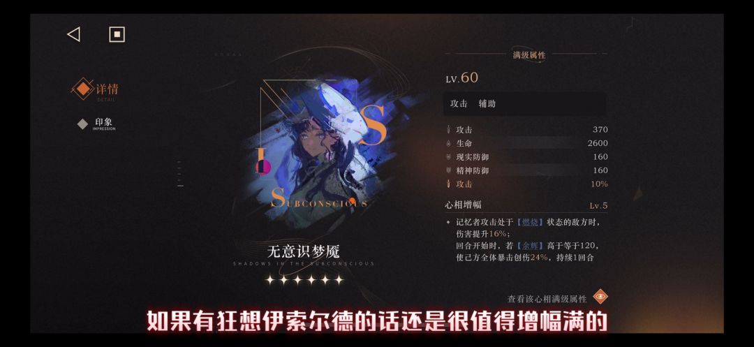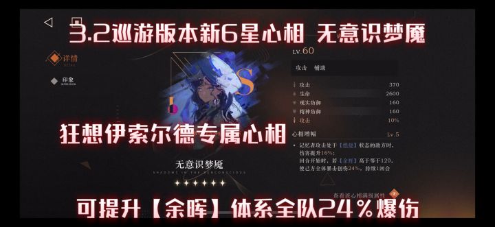 这个心相非常明显是为【余晖】体系量身定制的 完美契合狂想后的伊索尔德 是其在【余晖】有更加高的辅助效果 增幅的提升很明显 推荐祝福满