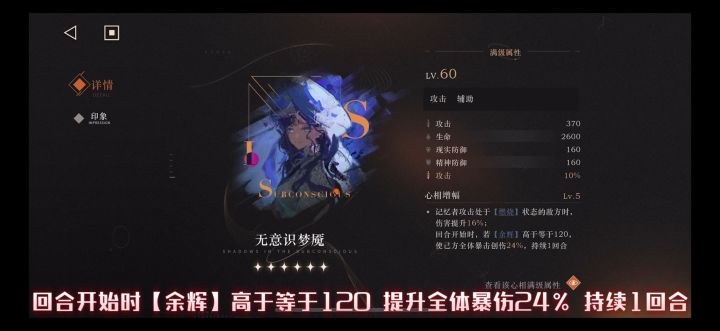 回合开始时 若【余辉】高于等于120 使己方全体暴击创伤24% 持续1回合