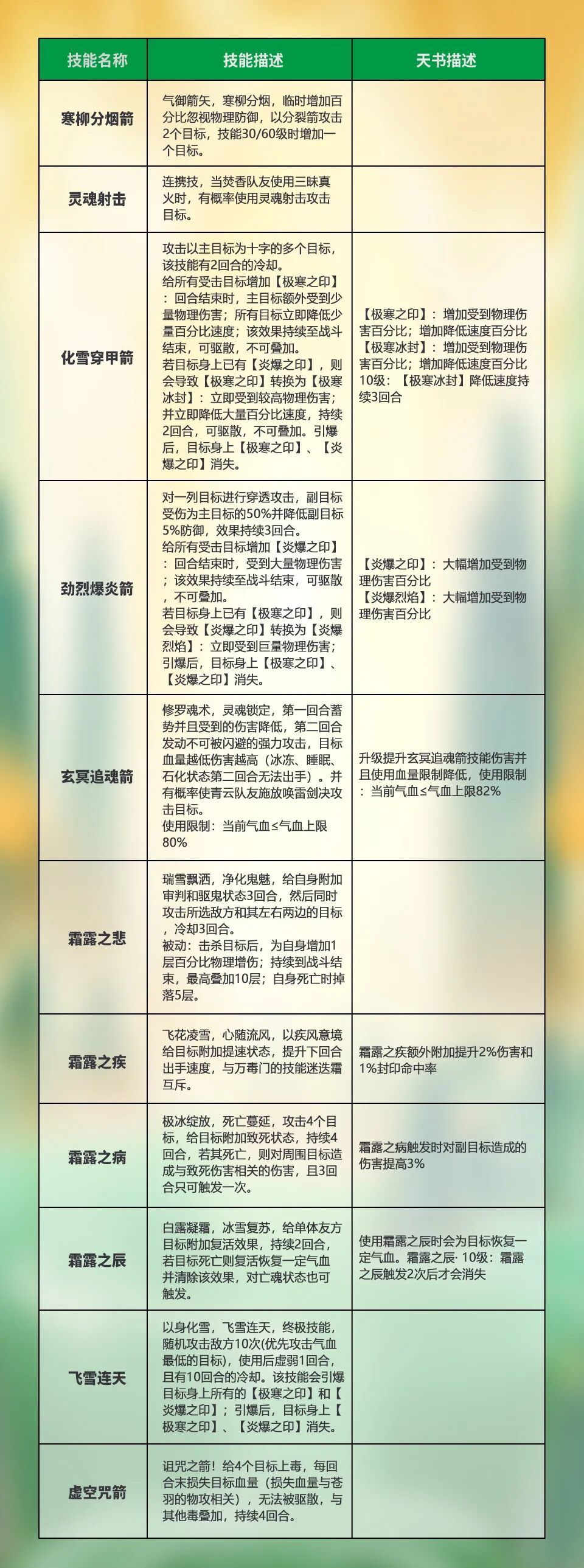 2、化雪穿甲箭攻击目标调整为以主目标为十字的多个目标,以多目标高伤害和群体减速为核心。在维持多目标高技能系数伤害的同时,也会为所有目标增加一个印记【极寒之印】,效果是造成百分比降低速度。