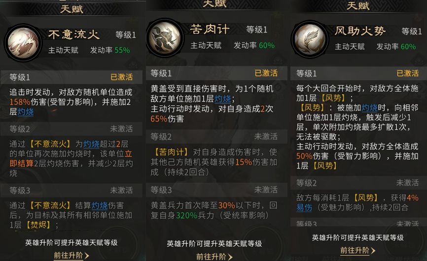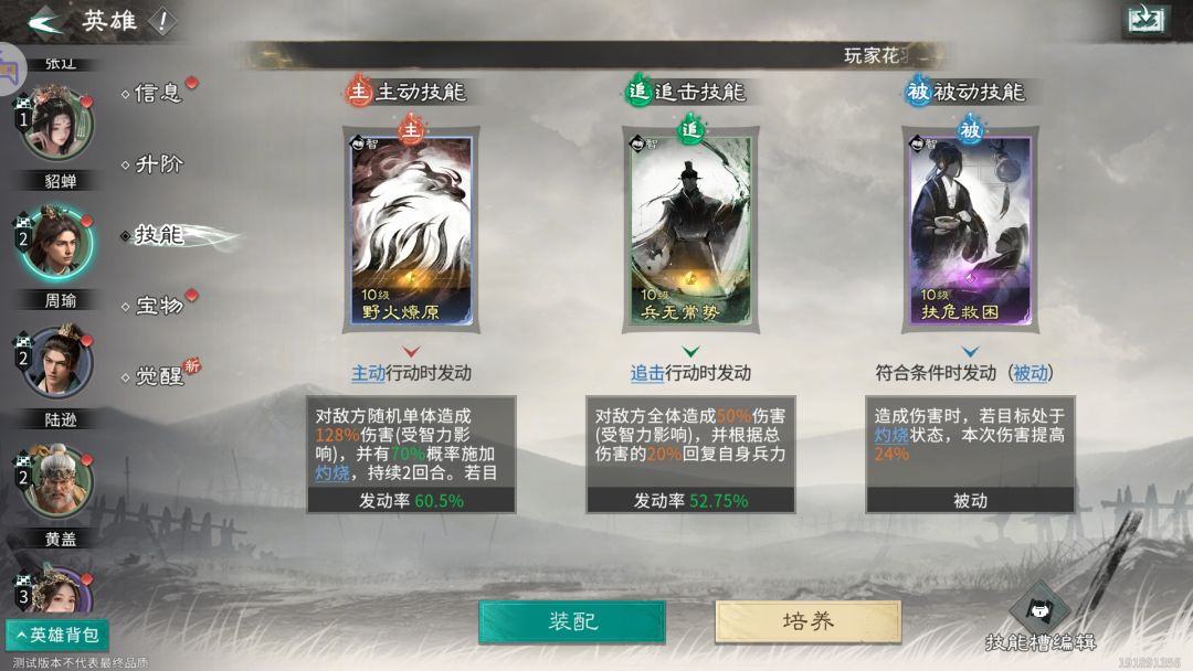 (1)周瑜、陆逊同为灼烧型英雄,技能选择一致。(灼烧:被施加目标回合开始时受到伤害并消耗1层)