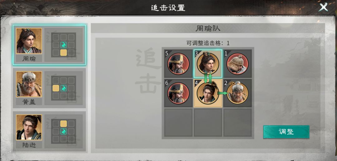英雄站位为陆逊站在周瑜和黄盖的追击格上,这样不仅可以触发2次陆逊的追击技能,还可以同时触发陆逊的天赋技能【不意流火】,对敌方单体造成伤害并施加2层灼烧。