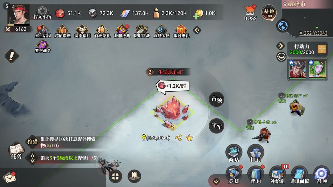 如已达到资源地占领上限,可点击头像后,再点击“土地”菜单,在放弃低等级资源地后,重新占领高等级矿产资源;但尽量不要越级挑战高等级怪和高级资源点,可点击守军查看敌人信息,因为角色重伤要排队进治疗仓复活且治疗仓较少,此外生命原石是前期最紧缺的资源,要合理规划使用。