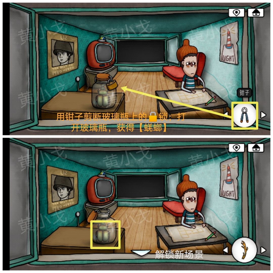 6.用【钳子】剪断玻璃瓶上的锁,打开玻璃瓶,获得【蜣螂】,解锁新场景