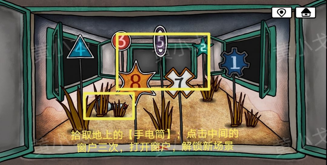 7.拾取地上的【手电筒】;点击中间的窗户三次,打开窗户,解锁新场景