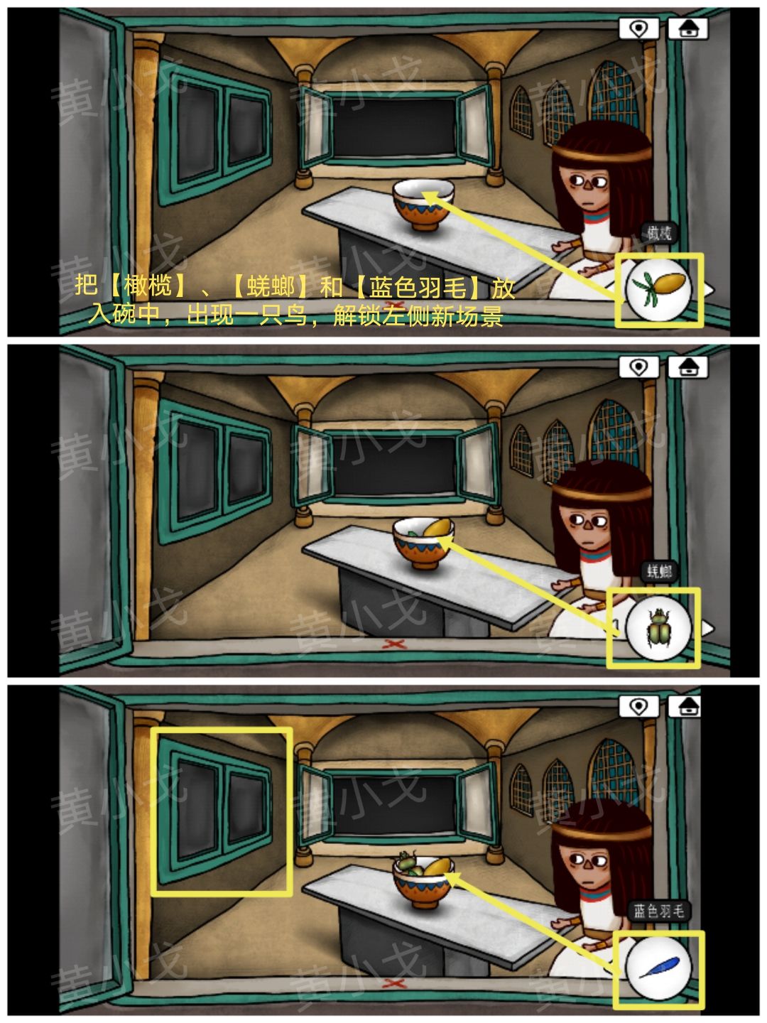 15.把【橄榄】、【蓝色羽毛】和【蜣螂】放入碗中,出现一只鸟,解锁左侧新场景