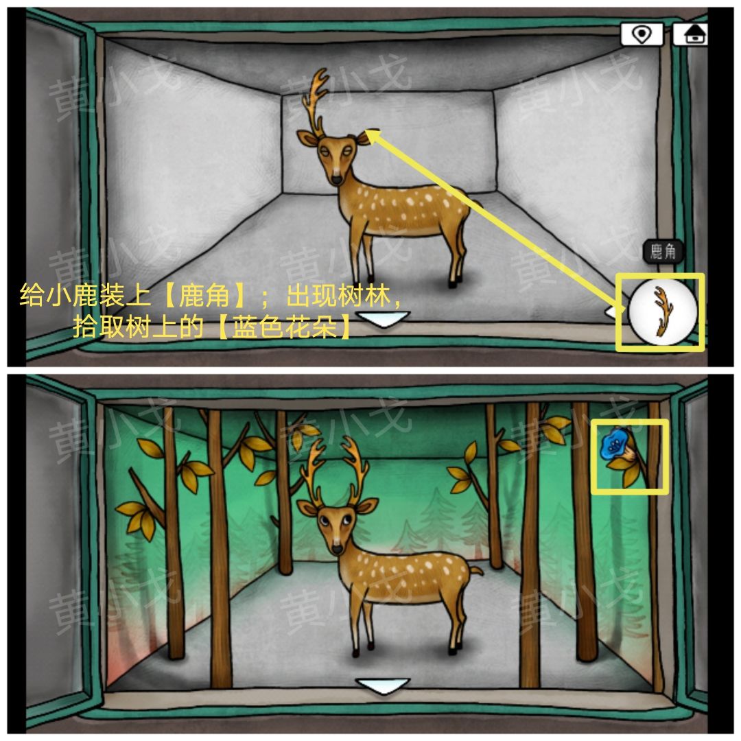 8.给小鹿装上【鹿角】,出现树林,拾取树上的【蓝色花朵】