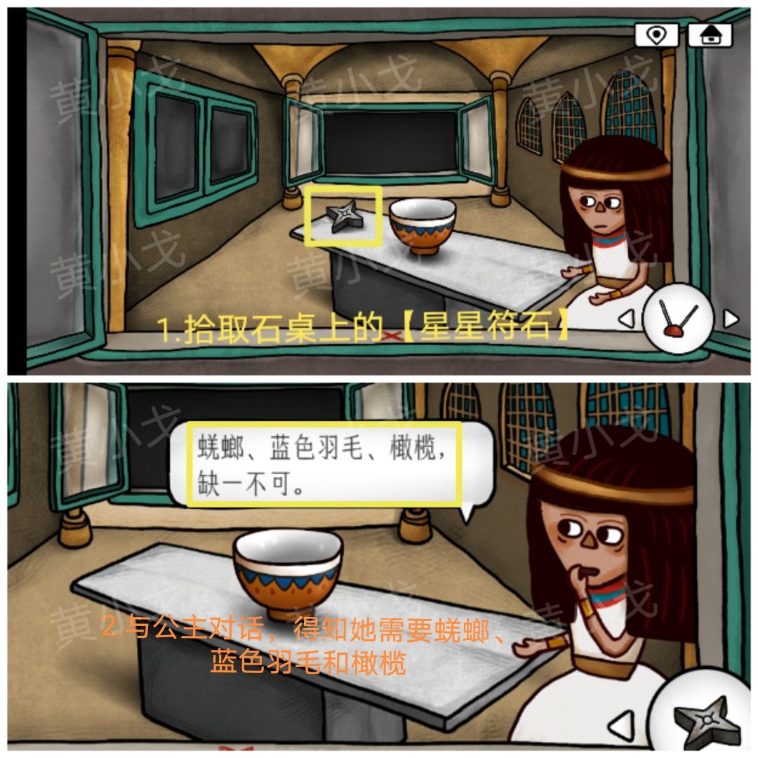 14.拾取石桌上的【星星符石】;与公主对话,得知她需要蜣螂、蓝色羽毛和橄榄。