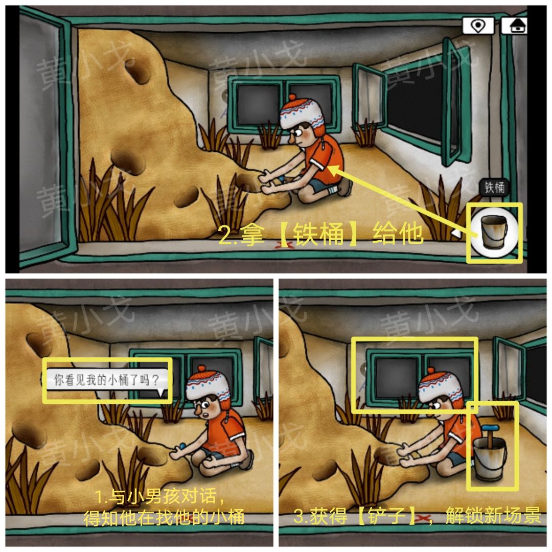 12.与小男孩对话,得知他在找他的小桶;拿【铁桶】给他,获得【铲子】,解锁新场景