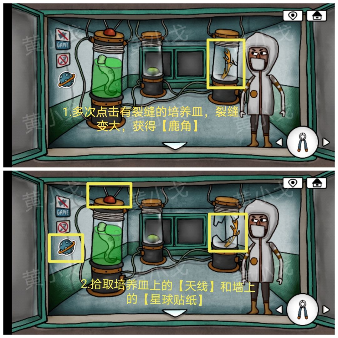 5.拾取培养皿上的【天线】和墙上的【星球贴纸】;多次点击有裂缝的培养皿,裂缝变大,获得【鹿角】