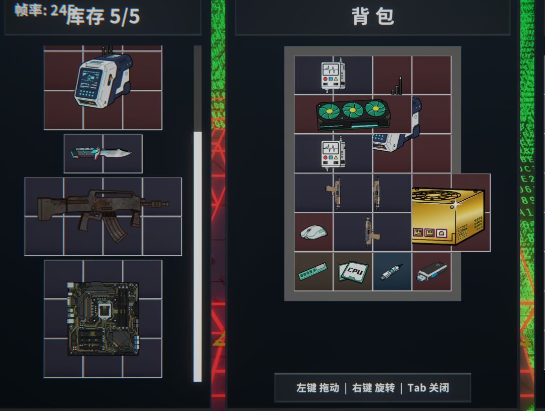 - 物品旋转: 增加了“右键旋转”功能。玩家现在必须合理规划背包空间,才能带走更多战利品,这就是我们设计的“堆叠”核心机制。
