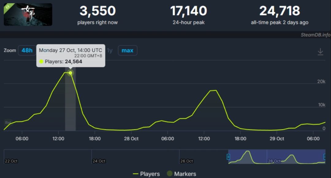 山雨工作室开发的江浙民俗题材双人恐怖解谜游戏《女吊》,10月27日上线免费Demo后迅速蹿红,SteamDB数据显示28日晚间同时在线人数达24718人,成Steam尖叫节最受关注新品之一。