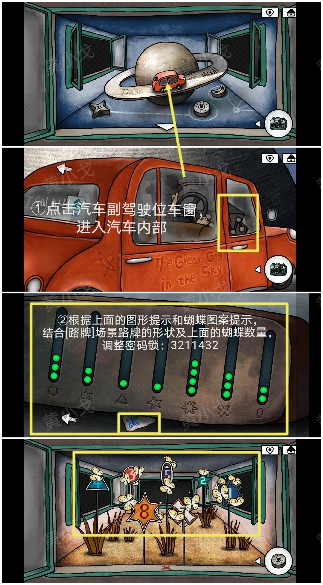 13.点击汽车副驾驶位车窗,进入汽车内部,根据上面的图形提示和蝴蝶图案提示,结合[路牌]场景路牌的形状及上面的蝴蝶数量,调整密码锁:3211432