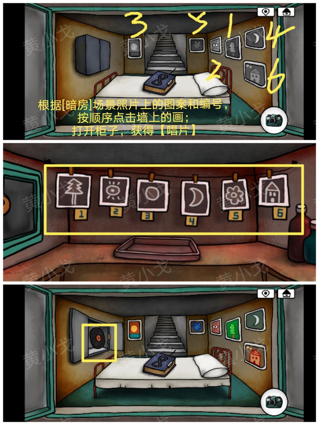 32.根据[暗房]场景照片上的图案和编号,按顺序点击墙上的画;打开柜子,获得【唱片】