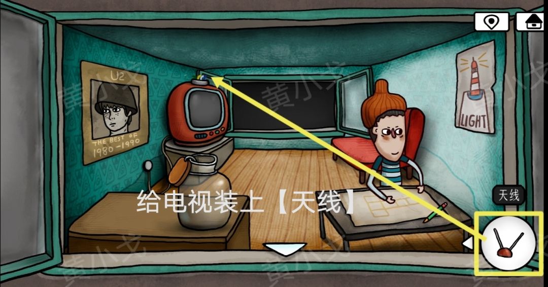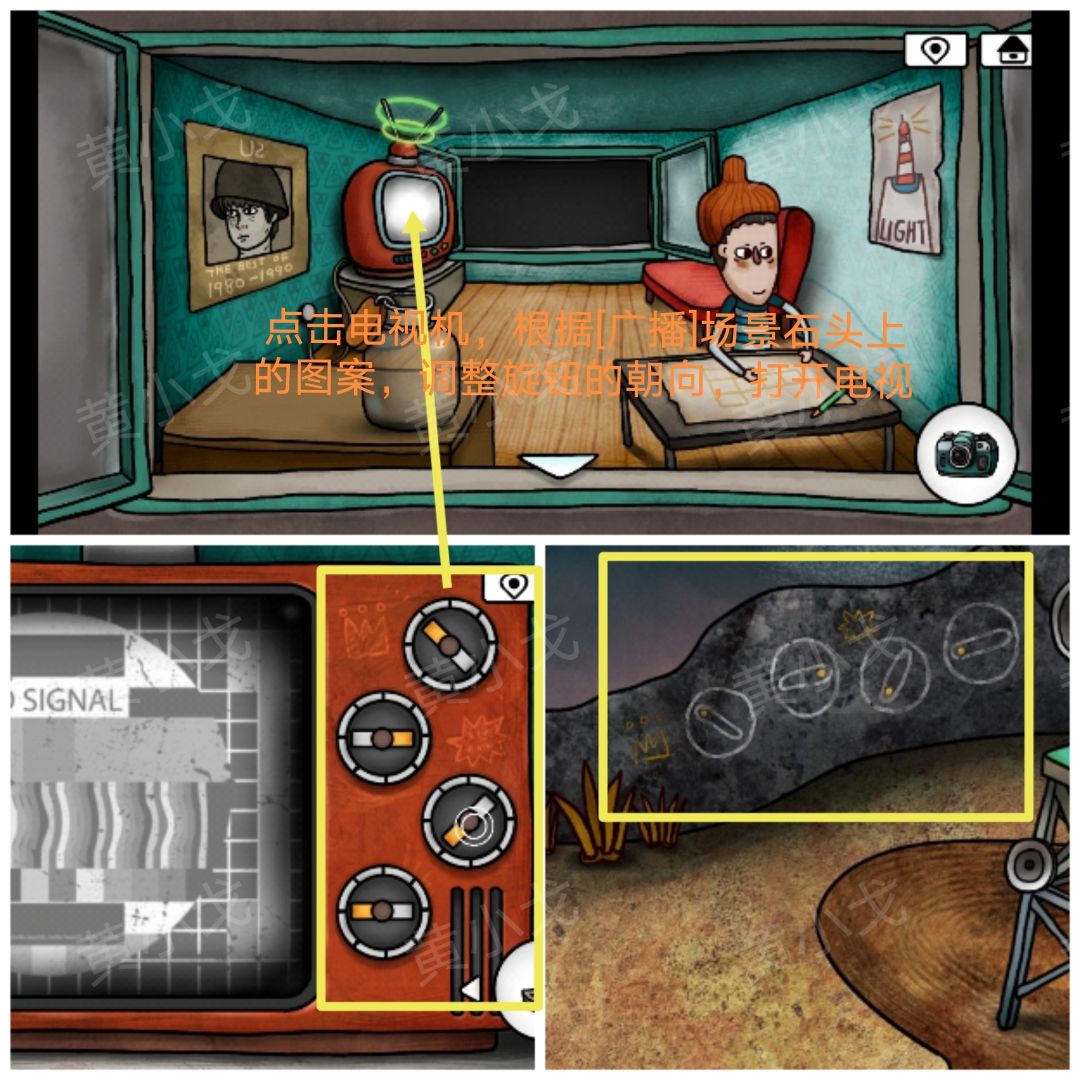 21.点击电视机,根据[广播]场景石头上的图案,调整旋钮的朝向,打开电视