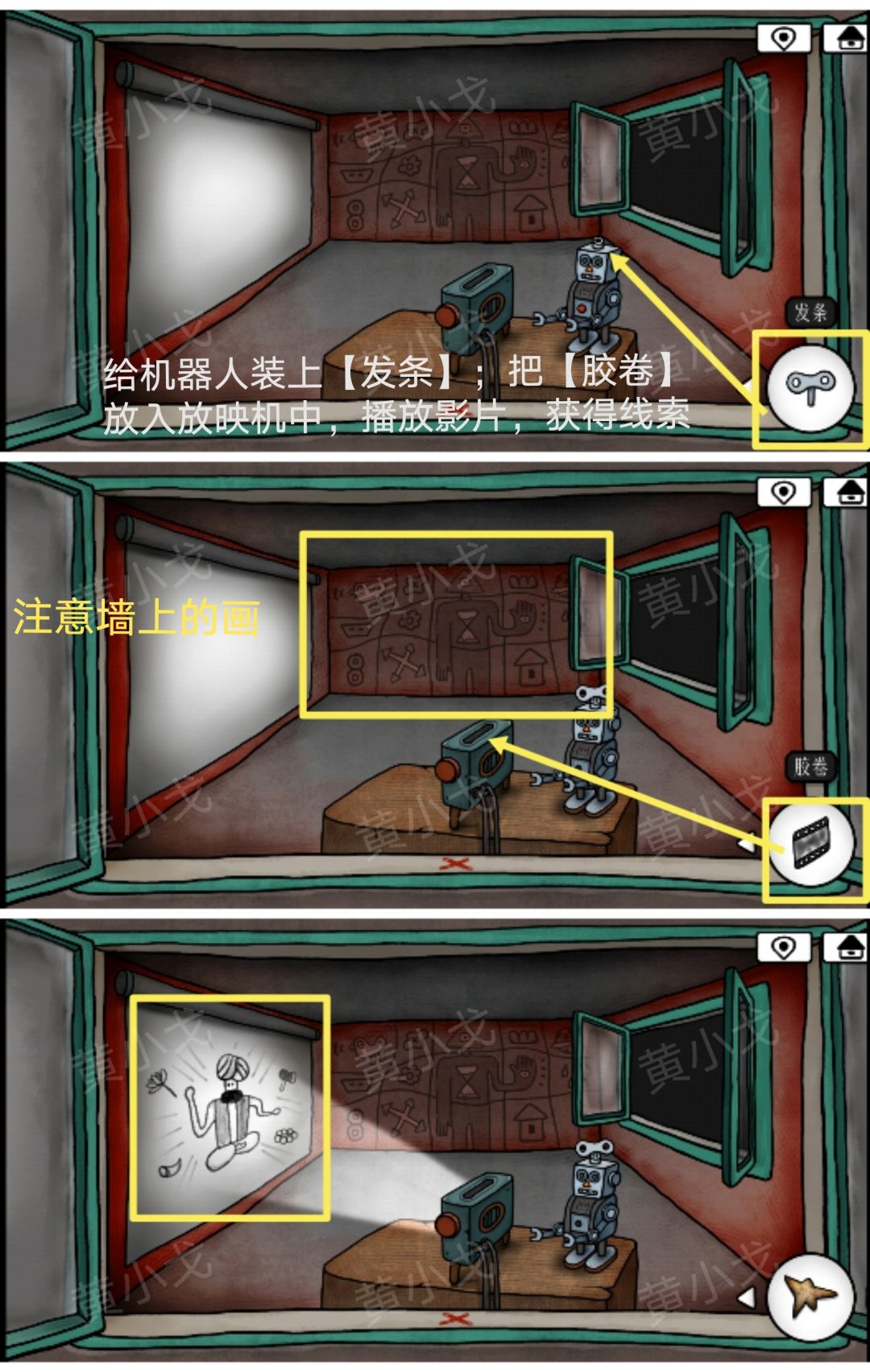 6.给机器人装上【发条】;把【胶卷】放入放映机中,播放影片,获得线索