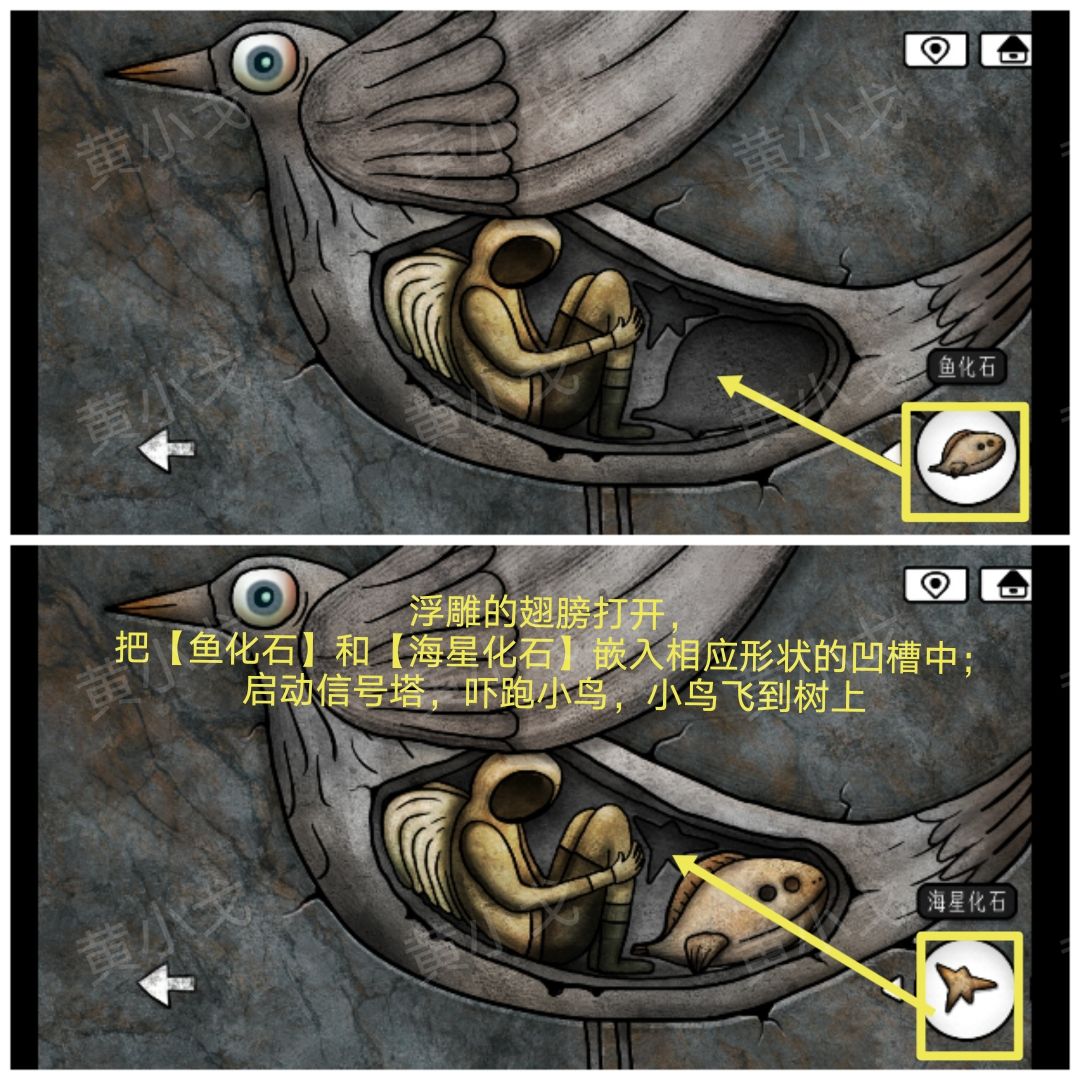 18.浮雕的翅膀打开,把【鱼化石】和【海星化石】嵌入相应形状的凹槽中;启动信号塔,吓跑小鸟,小鸟飞到树上