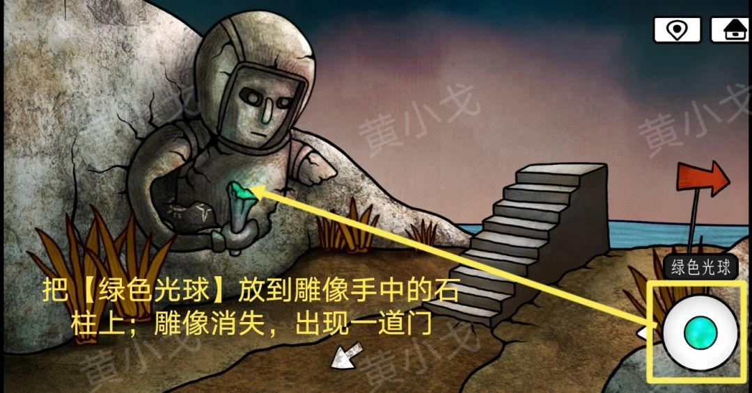 35.把【绿色光球】放到雕像手中的石柱上;雕像消失,出现一道门