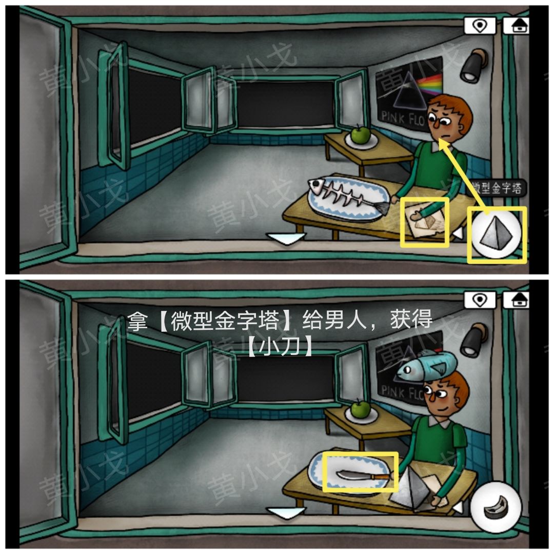10.根据桌子和黑板上的画,拿【微型金字塔】给男人,鱼复活,获得【小刀】