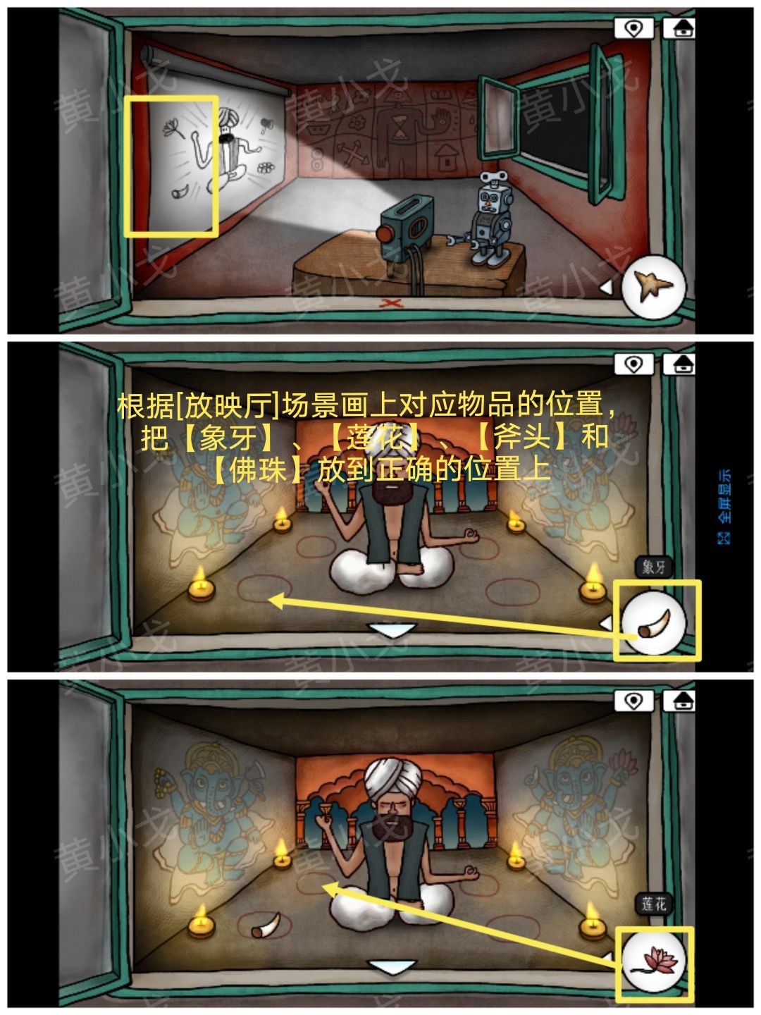 27.根据[放映厅]场景画上对应物品的位置,把【象牙】、【莲花】、【斧头】和【佛珠】放到正确的位置上