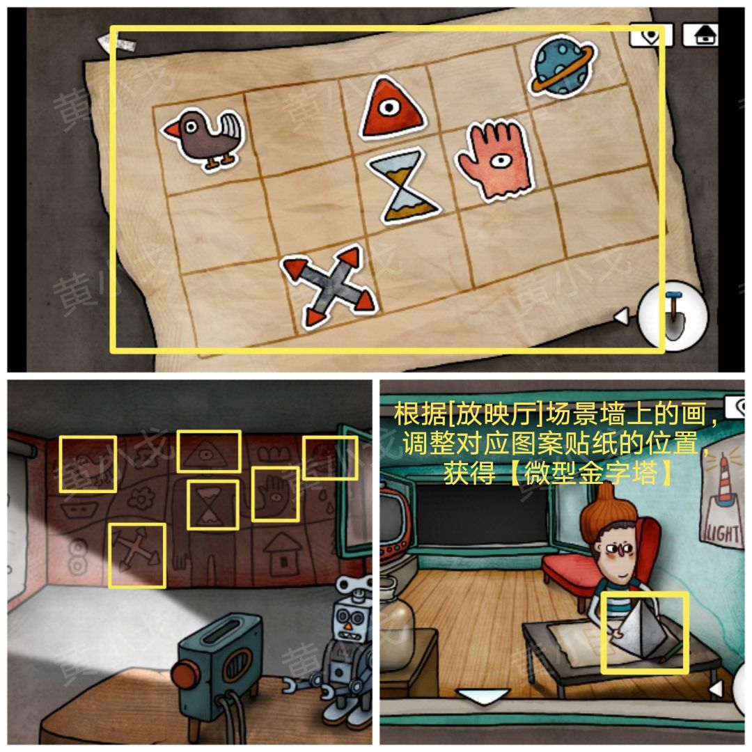 8.根据[放映厅]场景墙上的画,调整对应图案贴纸的位置,获得【微型金字塔】