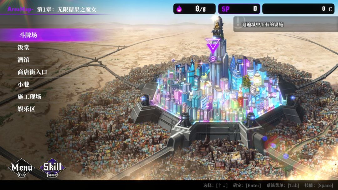 在赌城中,拥有各种各样的设施,包括斗牌场、饭堂、酒馆、商店街、小巷、施工现场、娱乐区。而且,每一种地方都有不同的作用,例如在酒店里,可以花钱进行享受,而根据花钱的多少,可以得到临时性的运气上限提高,或者是技能点数奖励;在施工现场,可以堵上所有金额进行扑克对决,而一旦胜利则可以拿到双倍入场金作为奖励……玩家可以合理利用这些措施,来推进剧情,或者寻求帮助,来帮忙在赌局之中,取得更多的优势。