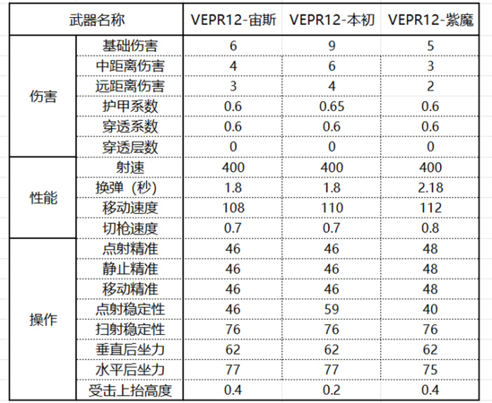 我们于其同类型的VEPR12-本初和VEPR12-紫魔做了对比,基础伤害方面,VEPR12-本初是伤害最高,而后是VEPR12-宙斯;在性能方面,VEPR12-宙斯拥有和VEPR12-本初相同的换弹速度和切枪速度;在操作方面,相较于VEPR12-紫魔,精准度、稳定性和后坐力二者均一致,在受击上抬高度方面,VEPR12-宙斯和VEPR12-紫魔一样,都是0.4。整体而言,VEPR12-宙斯保持了该系列英雄级武器弹道集中,射速快,伤害高的特点。那么,它的实战强度究竟如何?接下来我们重点解读。