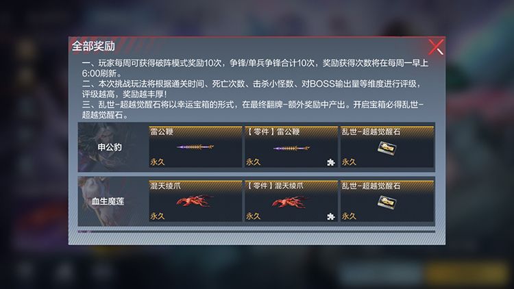 首先要注意通关效率,通关评价越高获取觉醒石的概率越高。封神狂潮有三种参战模式,这三种模式的选择非常重要。三种模式没有绝对的优缺点,要根据实际情况选择。个人认为,单兵争锋最为不推荐,因为是独自战斗,在无人配合的情况下,单人通关效率极低,特别是装备水平不强的玩家通关尤其艰难。一旦频繁阵亡可能还导致通关失败,难以拿到高评价。因此尽量不要选择单人通关,除非是在深夜匹配不到队友的时候选择。破阵是四人同行,按理来说是效率最高的,但匹配的路人队友水平和意识全靠运气,可能会匹配到喜欢蹲原地刷级以稳为主的队伍,大大延长了通关时间降低效率。