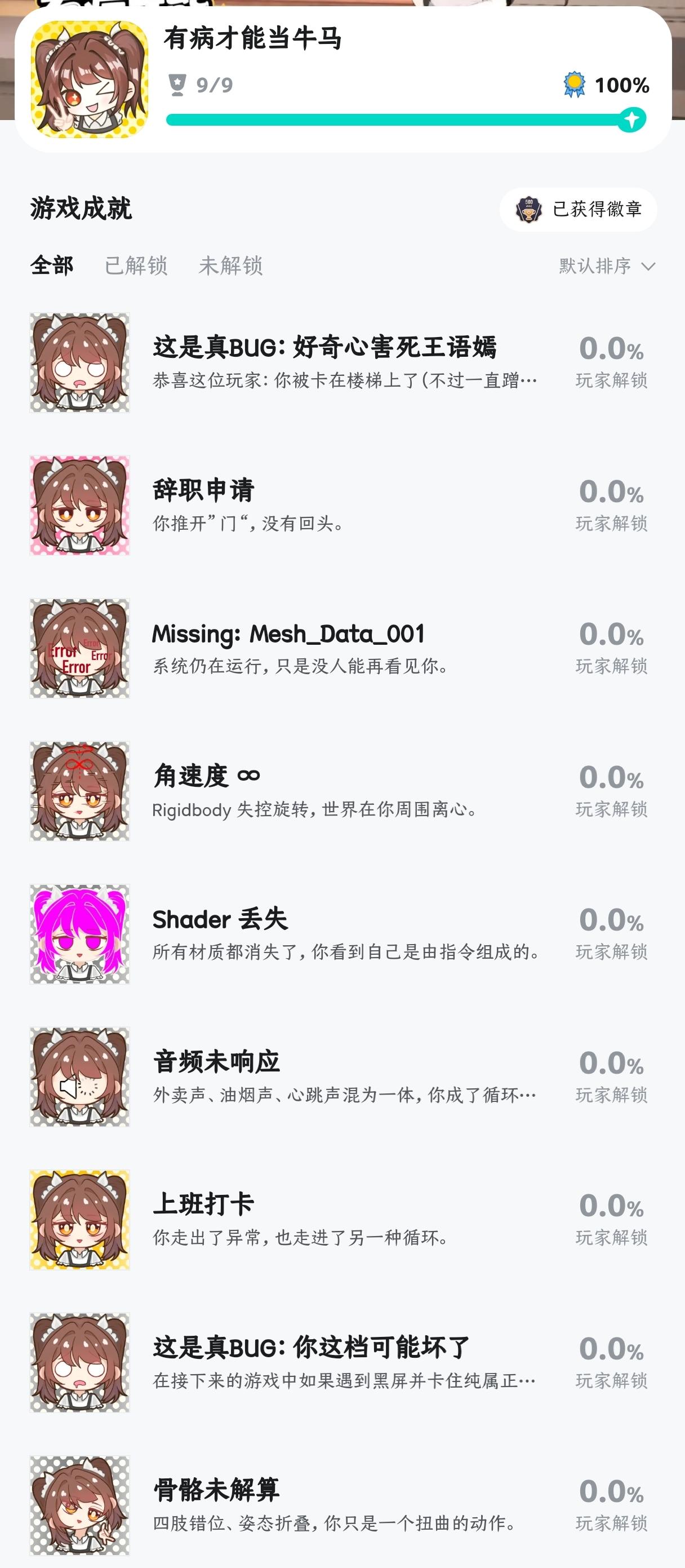 九个成就中,1个TE成就,1个NE成就,5个是BE成就(被bug侵蚀后的成就)2个隐藏成就。