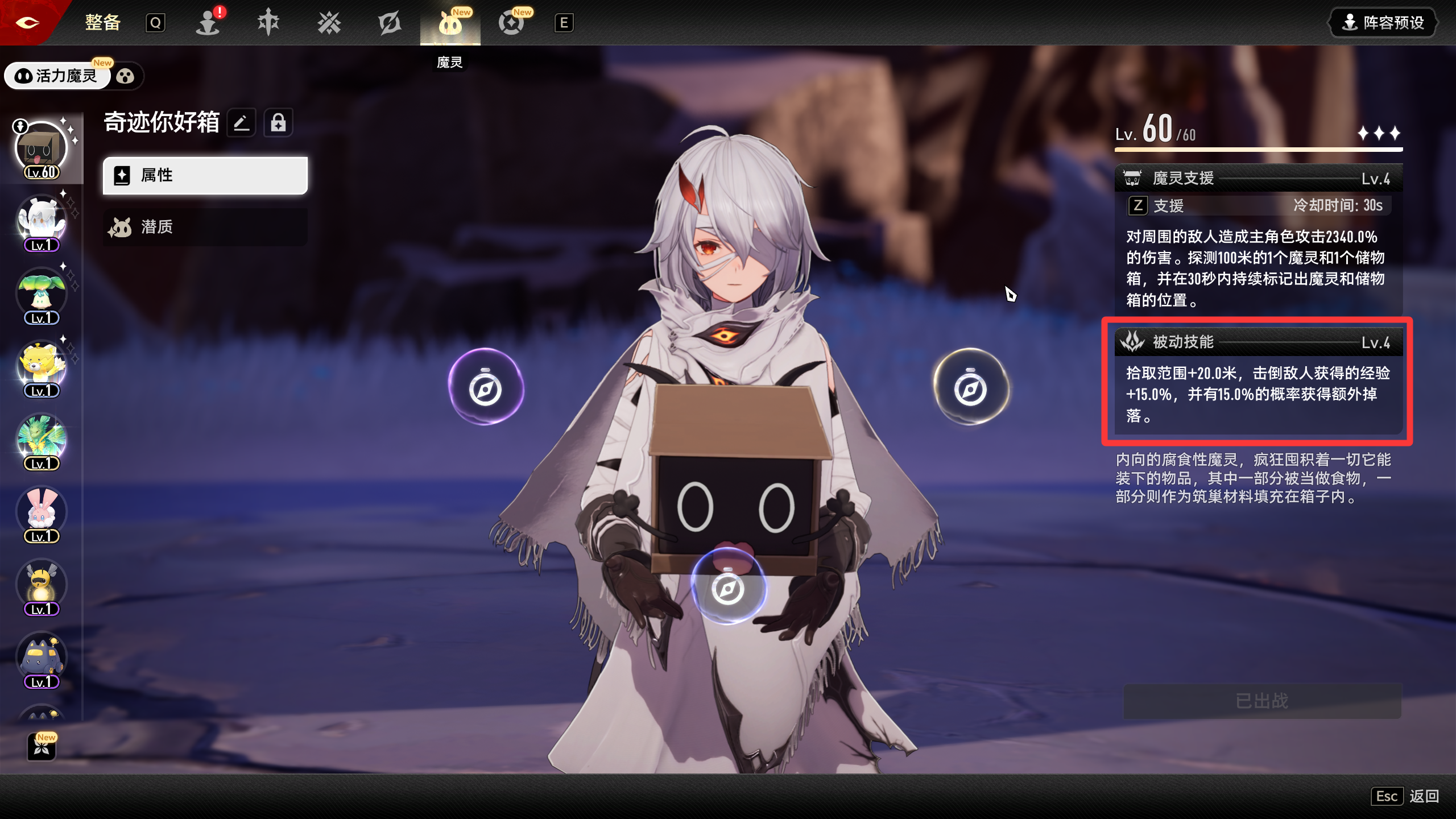 你好箱拥有着全游唯一的强大的机制:掉落概率增加和掉落范围增加。这是所有其他魔灵宠所没有的,我们推荐优先抓取你好箱也是为了这些机制。