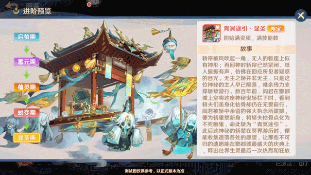 限定灵骑青冥途引将在酆都奇夜活动中首次登场,其技能冥魂献祭效果为:青冥途引在场时,骑乘者攻击前,根据相邻神将损失生命为骑乘者献上[祭品],最多同时获得15个[祭品],[祭品]能提供攻击与间接伤害加成,且当青冥途引在场时,骑乘者攻击前若携带15个[祭品],则有概率使所有目标[忘川],持续至攻击结束后,触发概率随灵骑进阶等级提高而提高。[忘川]:遗忘包括天赋、命格、信物、法术、神魂在内的所有未触发技能效果,不受异常状态命中和异常状态抵抗影响。