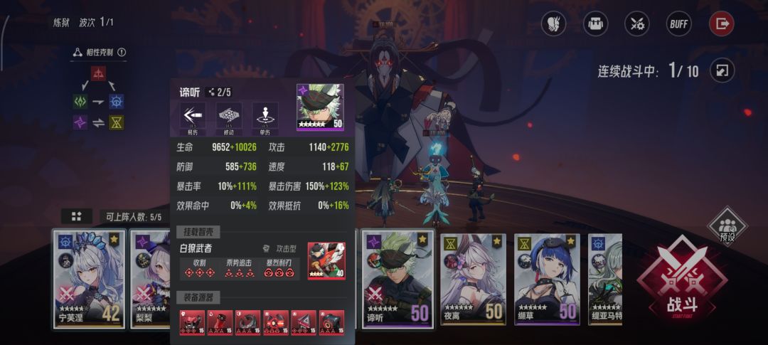 2. 绫罗,技能111,智壳超新星,第二个被动选速度。装备12疾驰+治愈即可,主属性选三生命。绫罗的速度最好是二速我这里拉到了277,可以驱散队友的扣血buff提高稳定性,最低也要高于输出。另外超新星+治愈足够解除BOSS的回血诅咒。