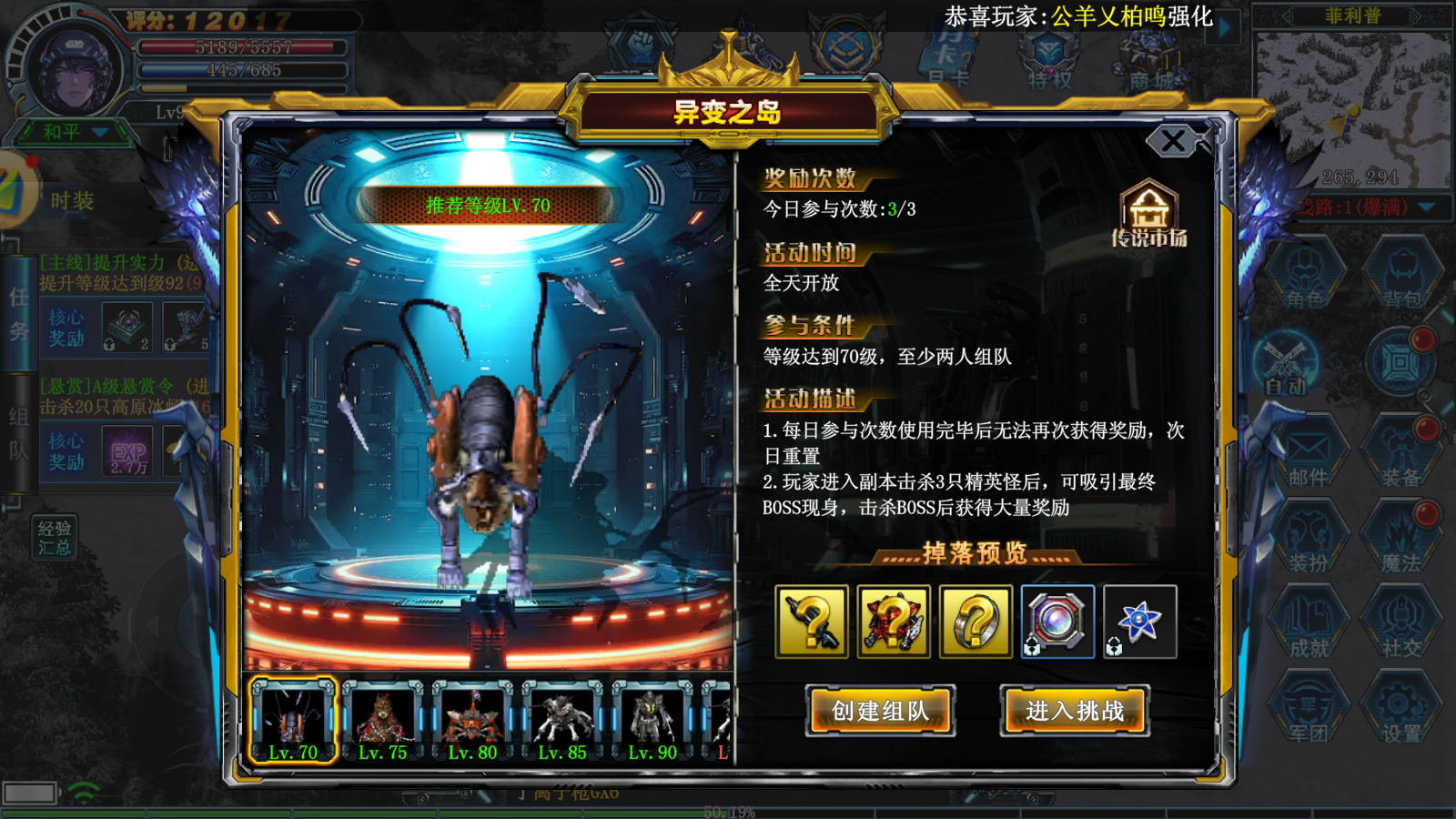 - 4. 异变之岛(等级≥70 级,至少 2 人组队)每日 3 次团队副本: