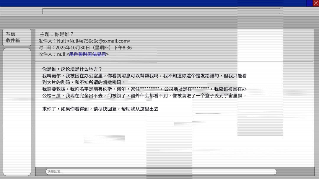 而且根本联系不到外界,我的手机没有信号,电脑里能打开的只有这个莫名其妙的论坛和收到的邮件。
