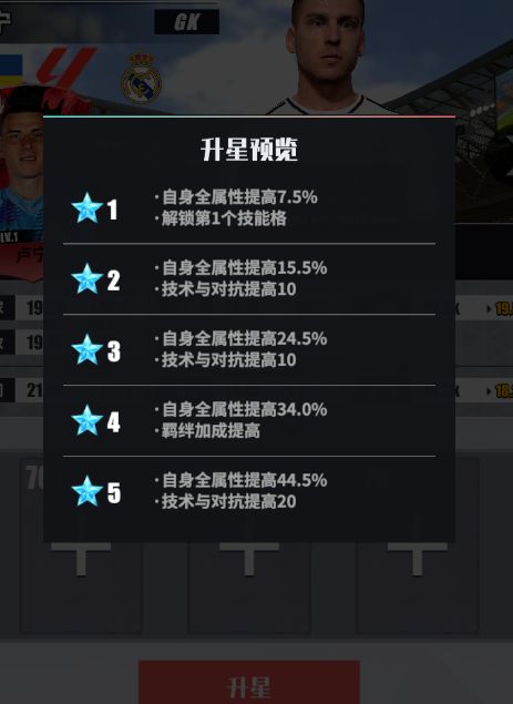 在游戏中升星一直是球员提升战力的重要方式,球员升级到1星即可解锁第一个技能格,星级的越高,所带来的自身全属性提升也就越高。