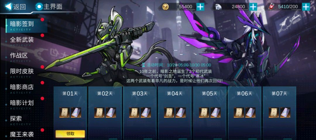 参与每日签到,可领取暗影书页*7、限定武装芯片*7