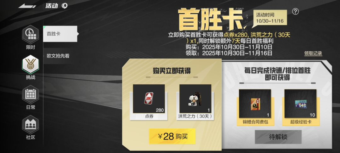 2)玩家可在10.30~11.10期间,购买首胜卡;10.30~11.16期间领取首胜卡内奖励。