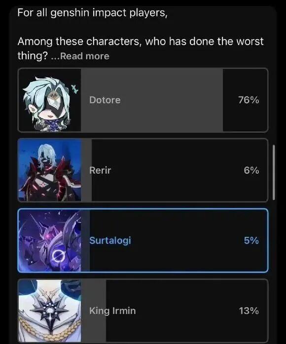 突然发现外服玩家还是喜欢各种各样奇奇怪怪的投票活动,目前又有外服玩家发起了,谁是提瓦特大陆最大恶人的投票活动,本来我以为猎月人雷利尔在剧情主线里面登场,并且大戏份的塑造之后,应该大多数玩家都会选他,结果没想到博士依然以76%的得票率遥遥领先,猎月人他的得票率甚至只有博士的零头。