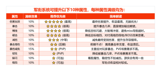 各位勇士好!军衔系统是游戏中一个长期、稳定且强力的全局属性来源。它不分职业,为所有职业提供10种强大的战斗属性。虽然养成深度巨大,前期看起来加成也不算多,但总体收益还是可观的。