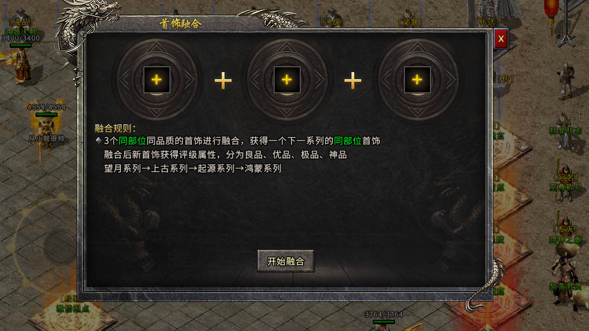 会员成长体系:会员等级提升主要依靠每日签到,即使不氪金,也能逐步享受会员福利,账号价值随之增长。装备融合系统:玩家可以通过融合系统(如首饰3合1、武器10合1)打造专属极品神装,所需材料主要通过打怪和分解装备获得。