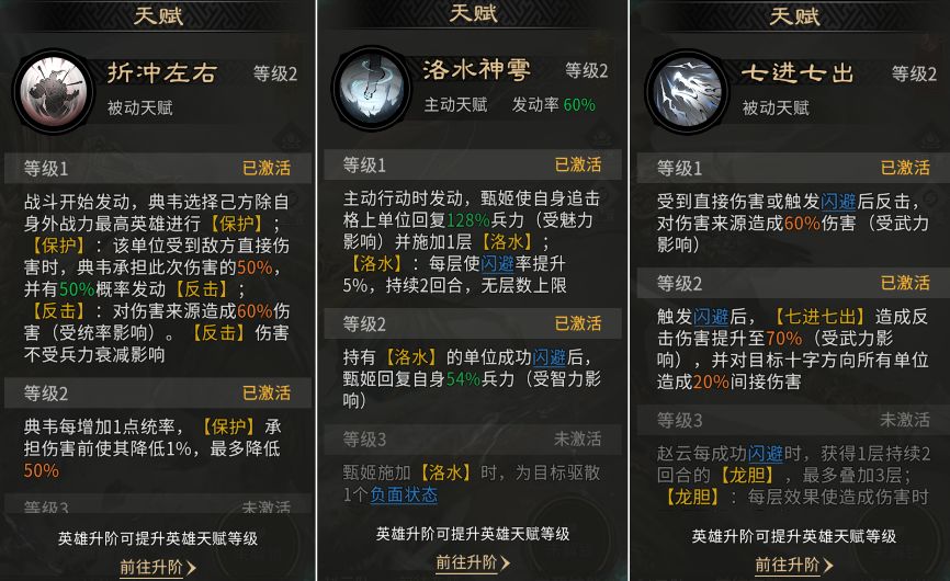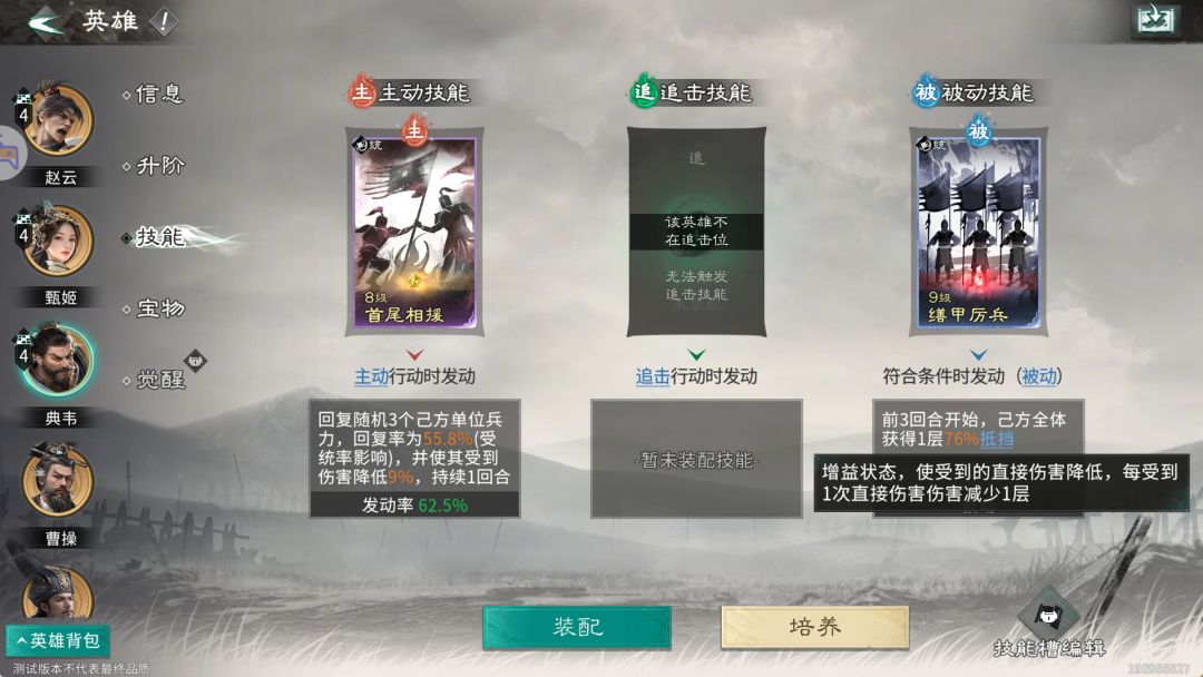 甄姬的自带天赋可以为赵云回复兵力并且提升赵云的闪避概率。赵云修改追击格为右上,让甄姬可以站在赵云的追击格内触发追击技能。
