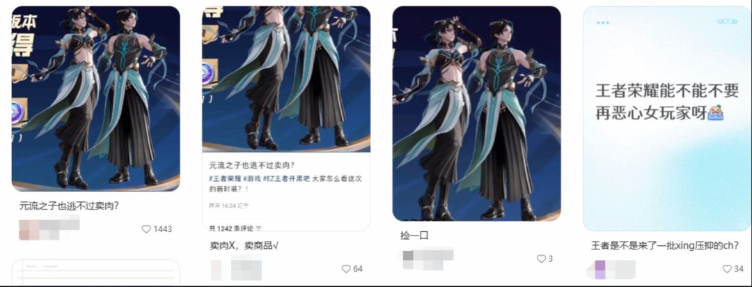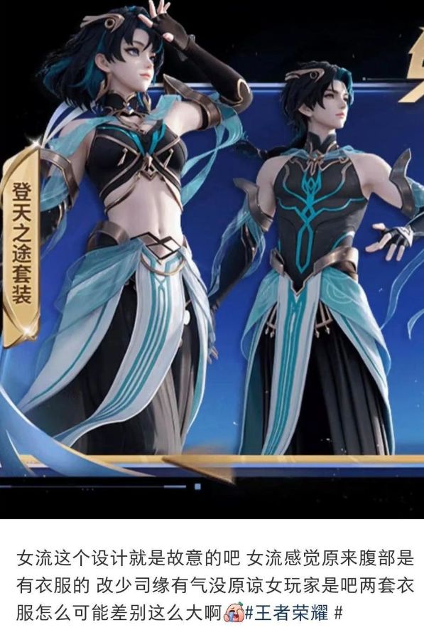 10月30日,《王者荣耀》免费赠送的可性别选择英雄元流之子,推出全新时装 “登天之途”,该时装因露肤度引发玩家热议,社交媒体上不少声音指责其设计低俗、“卖肉”、媚男。