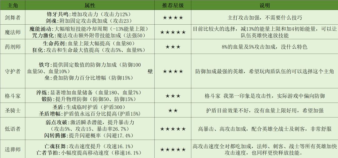 游戏一共分为八个主角,主角是不参加战斗的,每个主角的附加属性或能力不同,这里做一个表格给新人参考