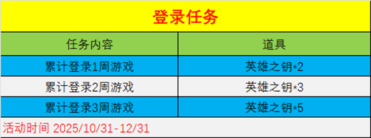 登录任务于10月31日开启,12月31日结束,足足两个月的时间,共计可获得“英雄之钥*10”,而任务内容只需要累计三周登录游戏即可获得这些道具,系统会在每周五刷新登录次数判定,即使是偶尔忘记登录的CFer,也有充足的时间完成目标。这样的安排不但保证了活跃玩家的收益,也照顾到了时间有限的玩家,可谓是相当贴心。