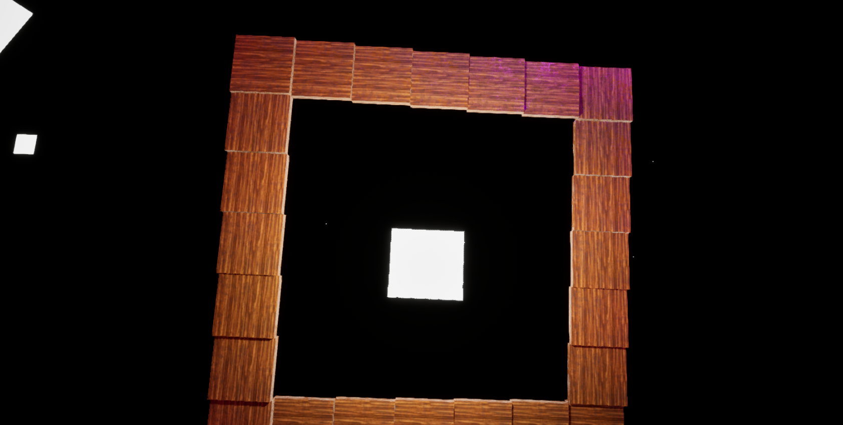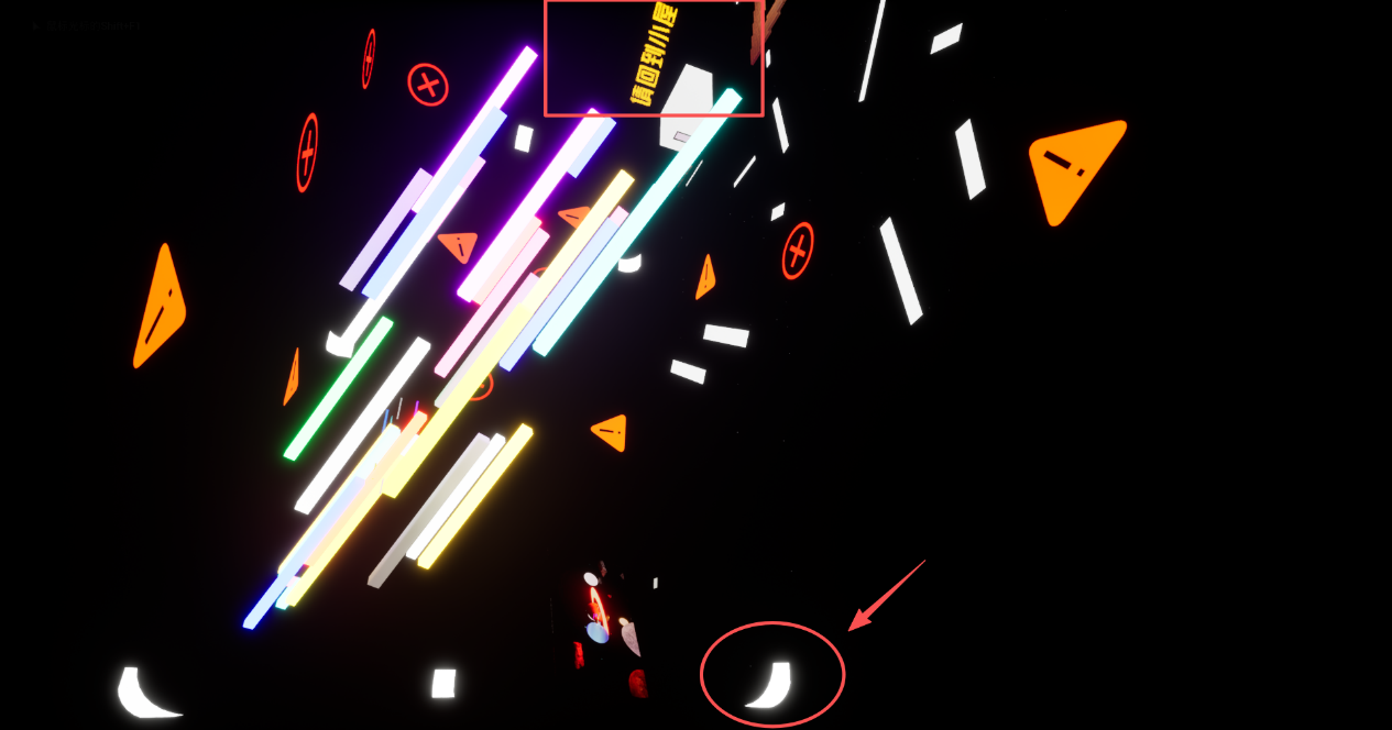 中间那一块长方体正面部分,你只能站到一个特定的地方,他才会看起来是个正方形,然后这个特定区域我也在地面上做了标注(白色亮光地板),这里有个坑就是你们可能以为白色发光地方是坑,想着跳下去会传送到出生点,然后不敢去踩,那么恭喜你成功被我“诈骗“了。你走到特定地方,屏幕上会生成一个白点,之后你对着中间黑色的部分就可以成功进入子关卡了。