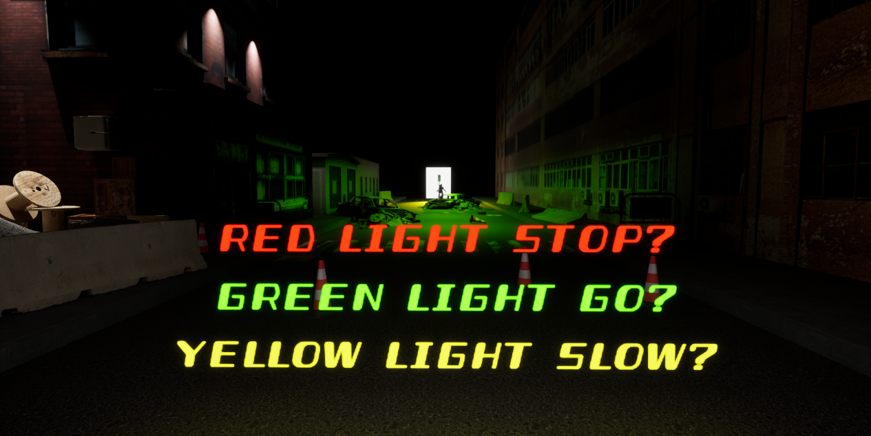 进入到子关卡中,还是先看提示,这里说“红灯停?绿灯行?黄灯减速?”。这关也是走到对面,那么按照惯例,大多数人可能想着绿色灯我走,红灯我停不就行了,但是为什么会走着走着传送回来呢。