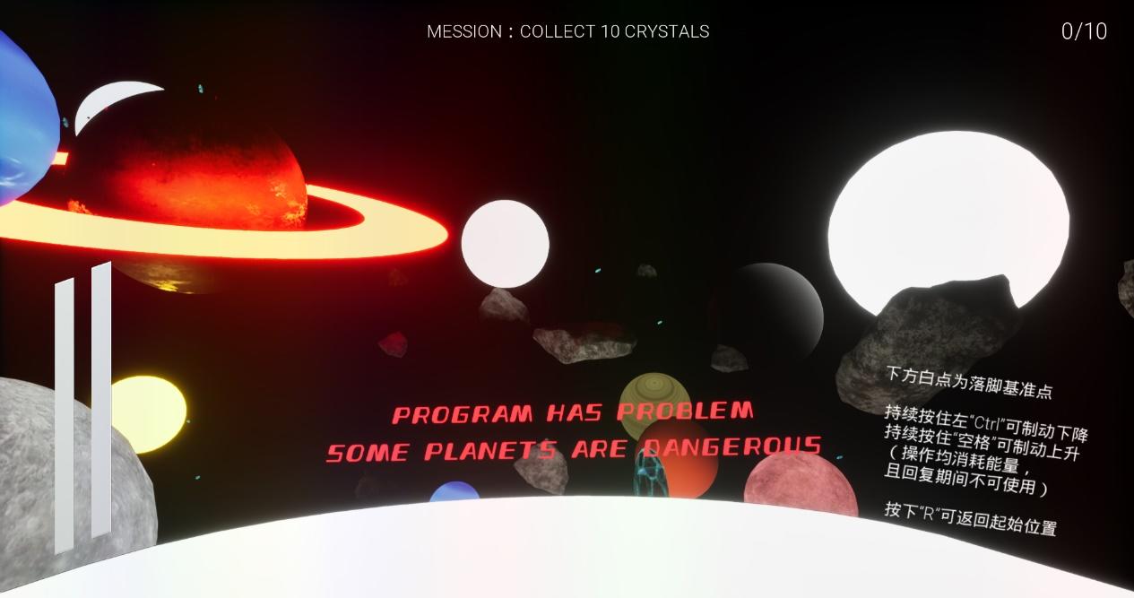 正常玩法:收集10个水晶即可通关,通过提示知道,持续按住空格或Ctrl键会制动上升和下降,控制好能量条可以实现快速飞行,如果发现自己到了某个地方不动了或者被卡住了,按下R键还可返回出生点(这里重力方向可能不对,传送回来之后发现还是在下降,这时候快速长按空格飞一下找个落脚点就行了)。通过不同的行星调整重力方向,对准目标水晶垂直飞,微调方向即可快速收集。