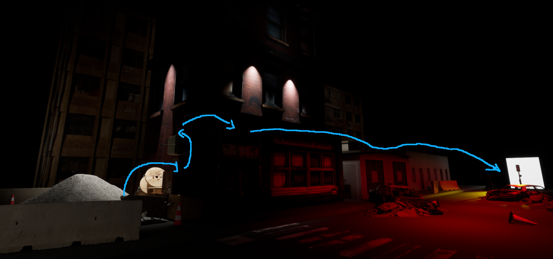 邪修:看最下方图片的蓝色路线,这里我专门布置的场景,还给了灯光,目的就是让你们发现这还能跳上去,然后沿着屋顶一路到终点,不用走路中间。