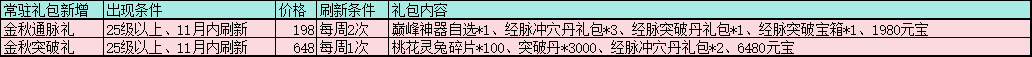 今日(11月1日)将有有两个礼包新增 ,元宝礼包新区冲刺系列提升了礼包内奖励、新增了经脉周礼包并提升了经脉周补助礼包的奖励、突破小礼增加了高级进阶石;近期会继续对礼包优化。