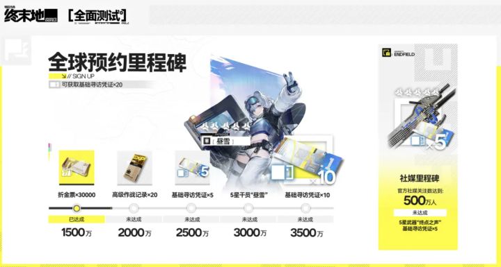 5️⃣若实现3000万预约目标,将直接赠送五星干员“昼雪”作为终极奖励。